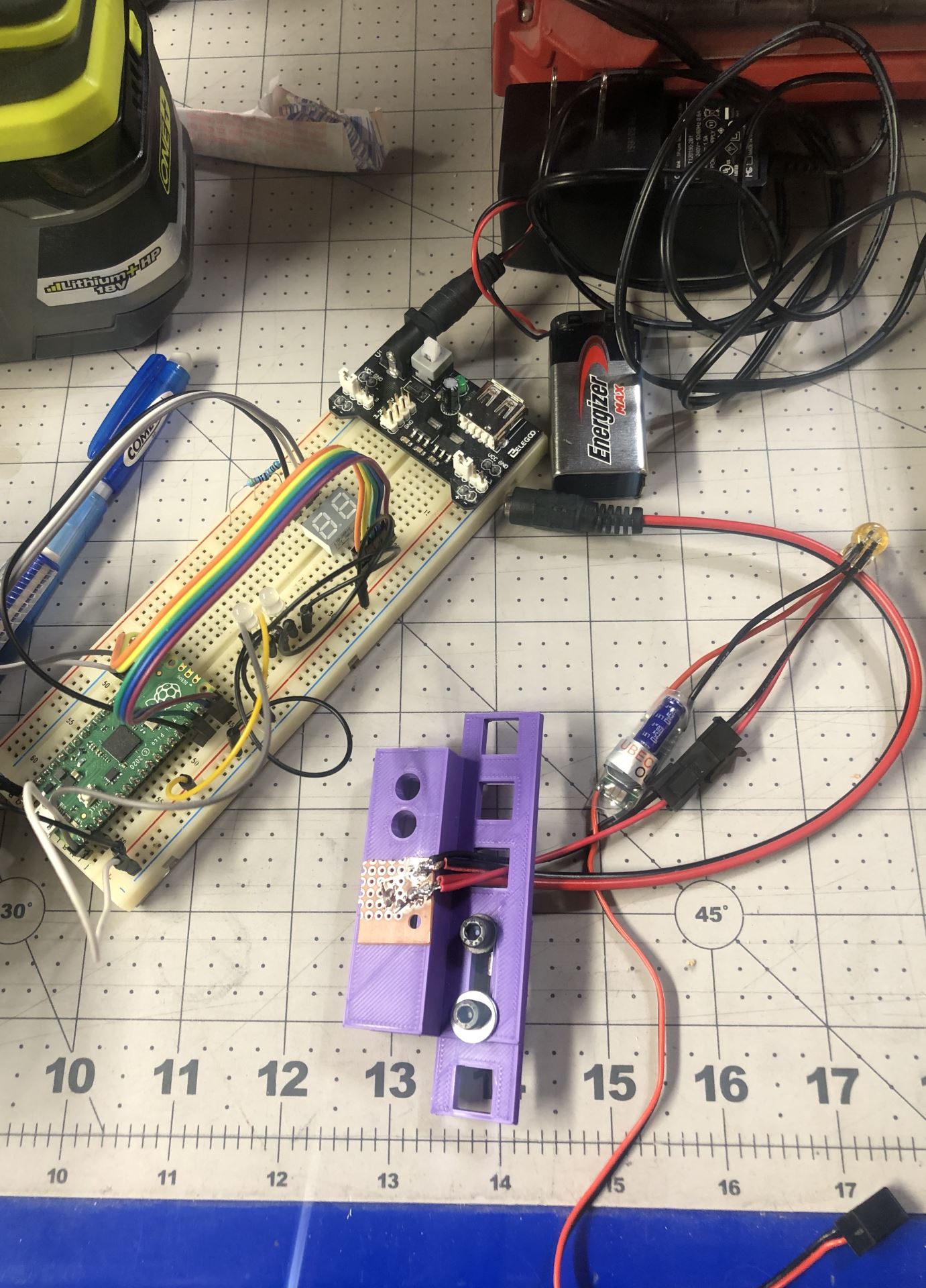 Building the Pure bracket was interesting, and if I needed to do it over again, I'd do it differently. the molex connector is attached to the chunk of protoboard, and since it requires 12 volts, it also acts as the power ingress for the entire project. the LEDs and Scorpio board are driven off a 12 volt to 5 volt adapter (the blue thing next to the black connector to the right of the printed parts), and the bezel plugs in to the molex connector. (that was also a difficult part to source, because Molex has a hojillion different part numbers for a 2x2 connector.)