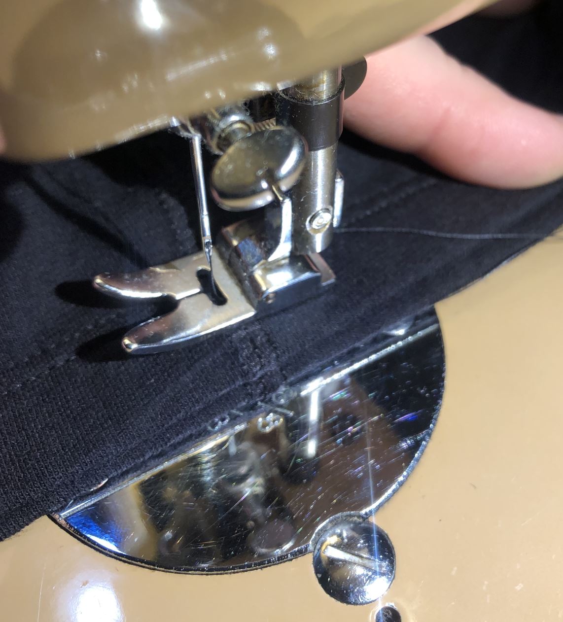 I start with the band of the bra, because that's the easiest part, but if you have a cheaper machine, it may struggle at the side seams due to the layers of fabric. On this 50's vintage machine, the seam just barely fits under the presser foot, and that's where I start.