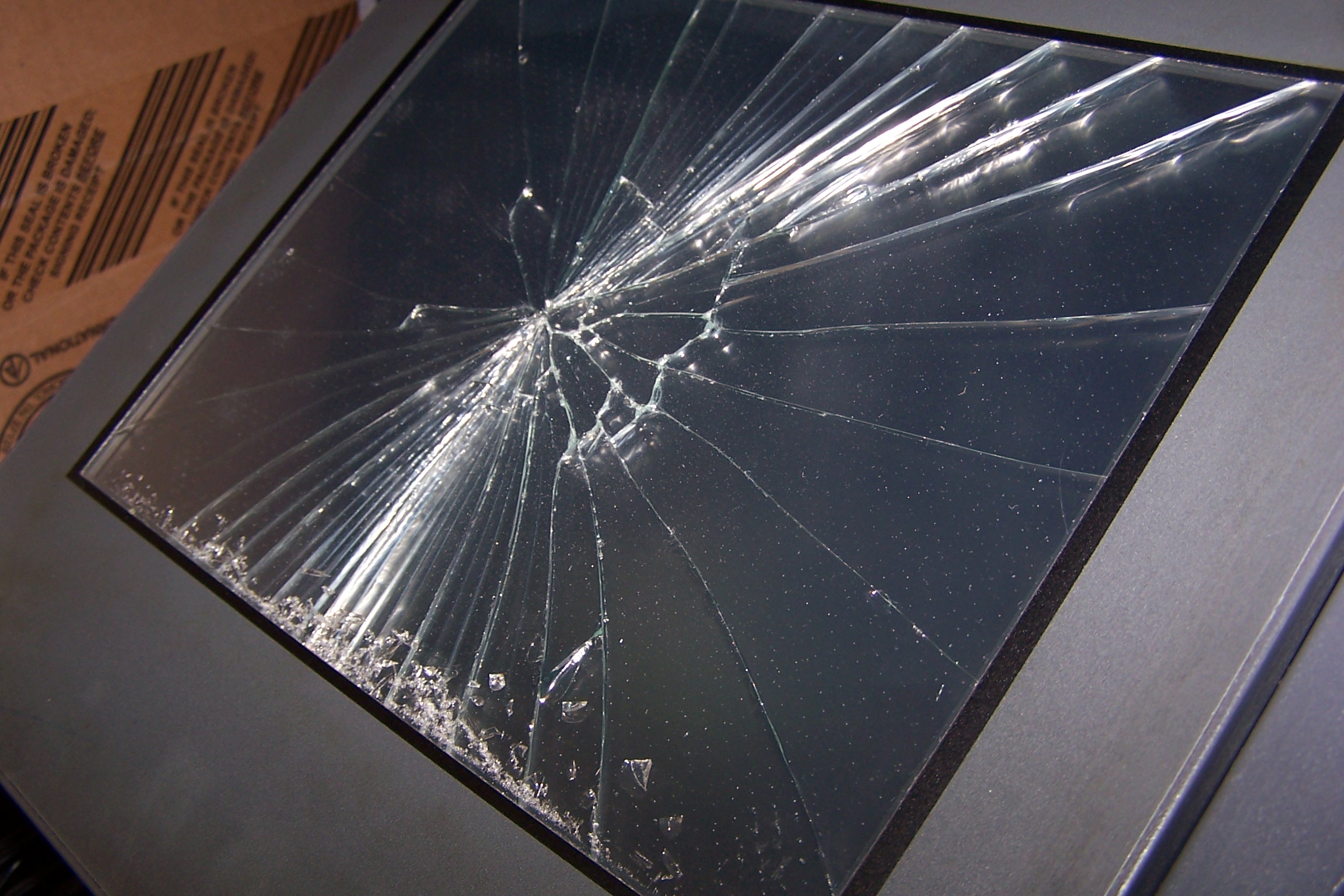 You'll note the glass chunks at the bottom; the touch panel wasn't broken, only the screen behind it. Them SurePOS units are pretty damn tough.